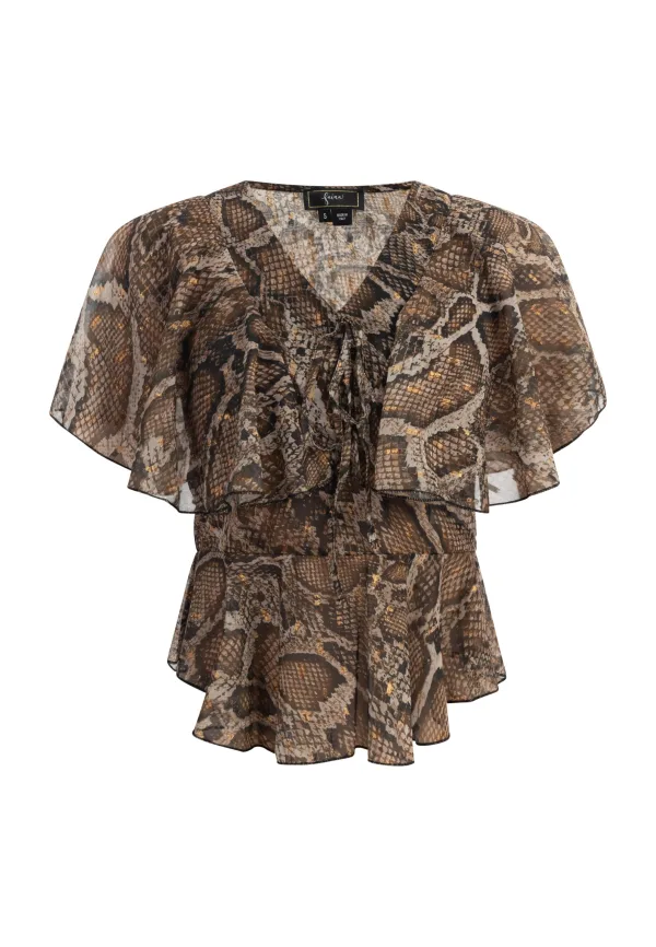 Geen vulling Faina creëerde deze vrouwelijke blouse voor bijzondere momenten. Het model, gemaakt in Italië, is gemaakt van een delicaat, semi-transparant materiaal dat soepel valt en de ruches subtiel laat bewegen. De exotische slangenprint is bedrukt met goudkleurige details, wat de blouse een feestelijk tintje geeft. De vrouwelijke V-hals met decoratieve strik zorgt voor mooie accenten, net als de volant aan de taillenaad. Blouse