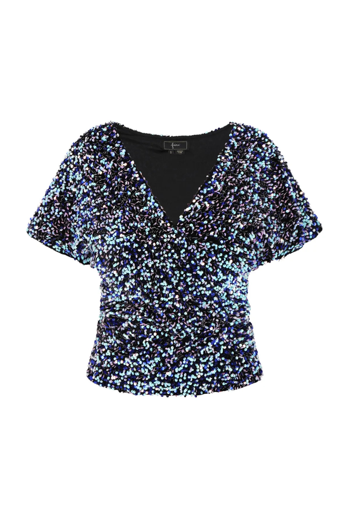 Voeg glamoureuze sprankeling toe aan je look met deze top met V-hals en een glinsterende, glitterende afwerking. De losvallende mouwen en het gedrapeerde silhouet zorgen voor een relaxte maar toch chique look. Perfect om een vleugje elegantie toe te voegen aan uw garderobe voor speciale gelegenheden. Blouse