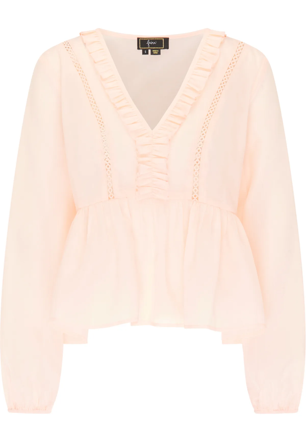 Geen vulling Deze semi-transparante blouse van faina tovert een lichte en romantische look tevoorschijn. De klassieke V-halslijn is versierd met ruches en kant voor een zelfverzekerde, ontspannen look. Elegant gecombineerd met een skinny jeans of een kokerrok creëer je een individuele look! Blouse