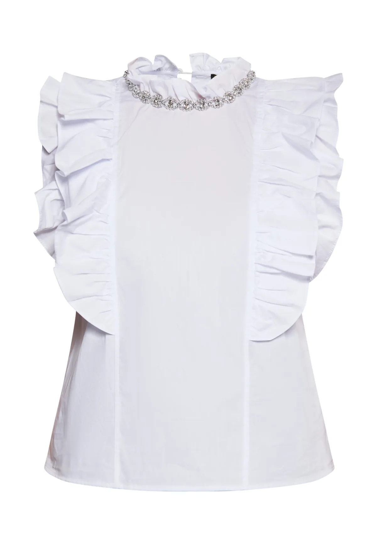 Deze mouwloze blouse heeft een hoge halslijn versierd met ingewikkelde versieringen, wat een vleugje verfijning toevoegt. De ruches die vanaf de schouders langs de zijkanten lopen, zorgen voor een stijlvolle look, terwijl de losse pasvorm comfort en bewegingsvrijheid biedt. Deze blouse is perfect voor formele of semi-formele gelegenheden en is ontworpen om een statement te maken met zijn unieke stijl en decoratieve kraag met juwelen. Dit product maakt deel uit van de Poplin-collectie Blouse