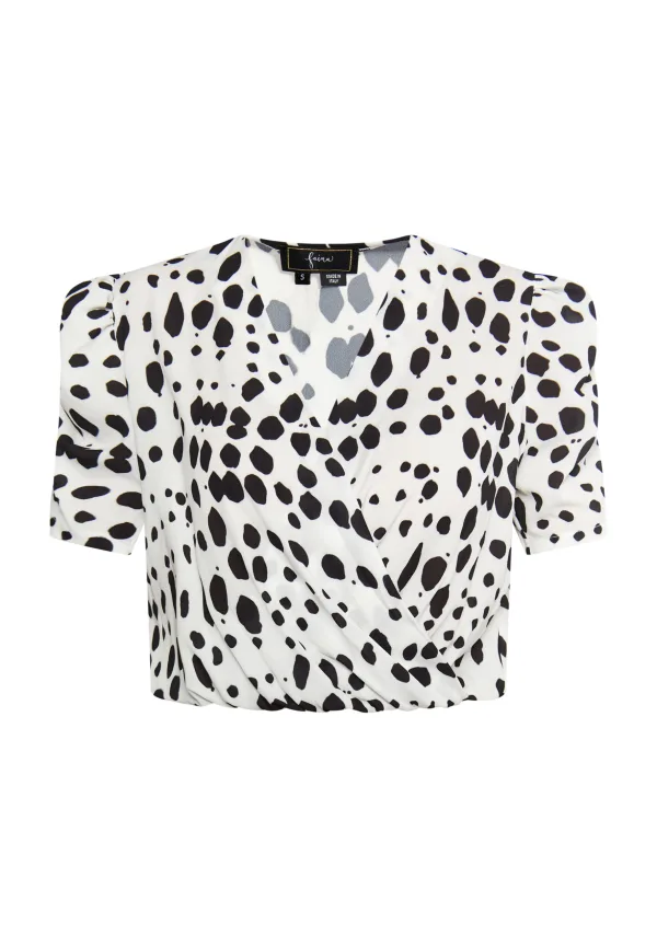Met het korte blouseshirt bewijst faina opnieuw hoe vrouwelijke lichtheid eruit kan zien. Het is gemaakt in Italië van een probleemloze stof met een zwart-witte stippenprint en heeft een aantrekkelijk wikkelontwerp met korte pofmouwen en een elastische zoom. Hierdoor past de blouse perfect bij broekpakken, blazers en kokerrokken, die deze winter erg populair zijn. Blouse