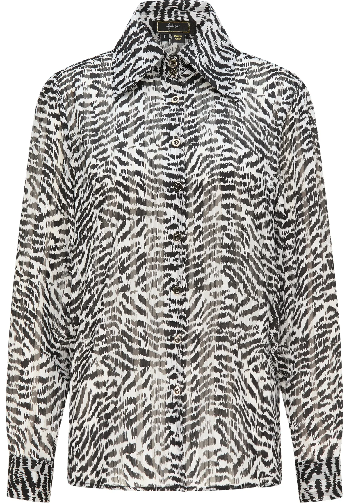 Dierenprints maken altijd een grote entree. Dit semi-transparante model van faina, met zijn opvallende tijgerlook en delicate metalen draden, is daarop geen uitzondering. Stijlvol geaccentueerd door de grote overhemdkraag, de rechte snit en de goudkleurige knopen, gaat het ontwerp perfect samen met een klassieke stoffen broek en pumps. Blouse