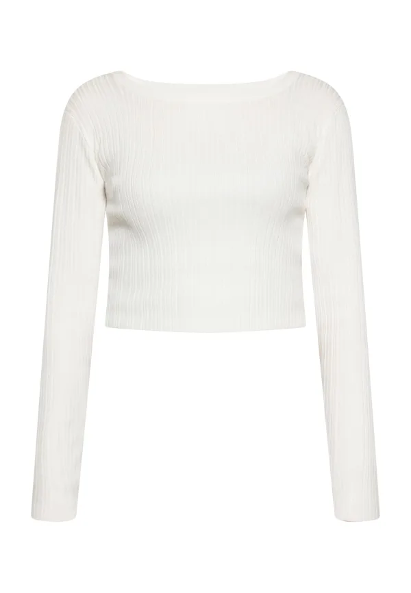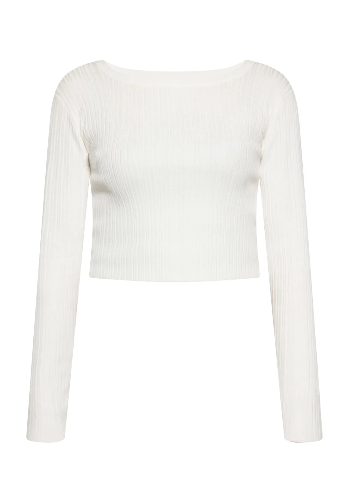Maak kennis met een stijlvolle en moderne blouse met een open achterkant. Deze blouse met lange mouwen heeft een geribbelde textuur, een nauwsluitend silhouet en een brede ronde halslijn. De cropped lengte zorgt voor een trendy look, terwijl de unieke sluiting aan de achterkant met sierknopen voor een vleugje elegantie zorgt. Met aansluitende mouwen en rekbare stof is dit kledingstuk perfect voor iedereen die graag met zelfvertrouwen wil pronken met zijn stijl. Blouse