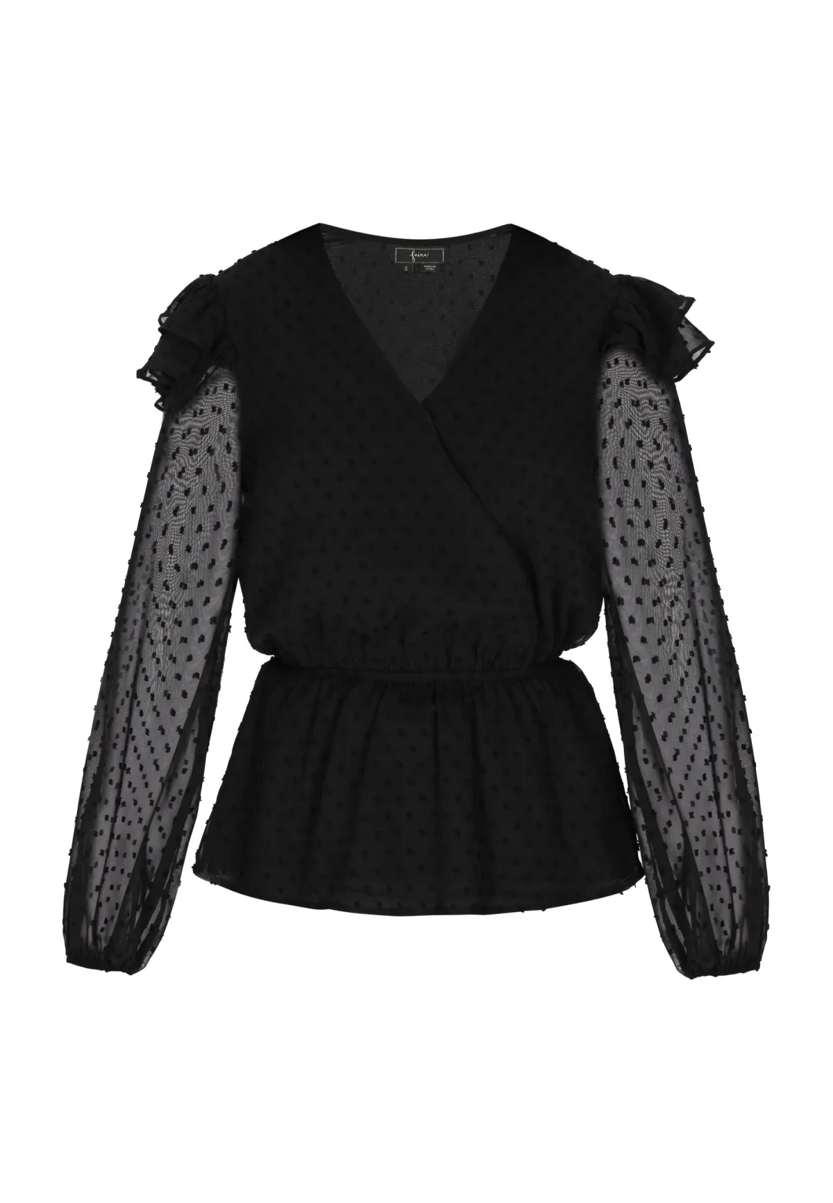 Ontdek een chique plumettiblouse met lange klokmouwen en ruches. Dit elegante exemplaar heeft een V-halslijn en doorschijnende mouwen met textuur, versierd met delicate verhoogde stippen. De verzamelde ruches op de schouders zorgen voor een subtiel pofeffect, terwijl elastische manchetten de polsen accentueren. Een nauwsluitende elastische tailleband accentueert het silhouet. Omarm een vrouwelijke en sierlijke stijl met deze zwierige, lichtgewicht blouse. Dit product maakt deel uit van de Plumetti-collectie Blouse
