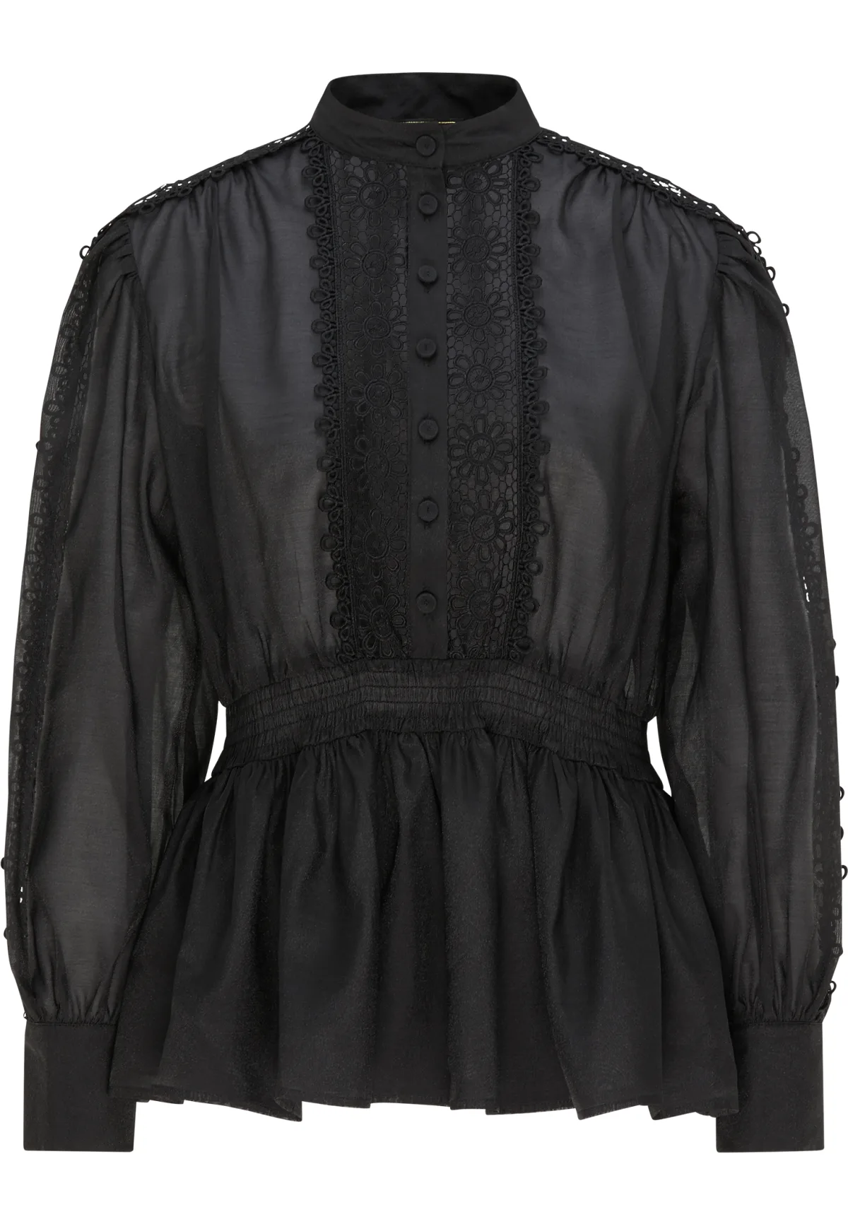 Deze semi-transparante blouse van faina heeft een romantische, speelse uitstraling. Het delicate model, met een kleine opstaande kraag, sierknopen en bloemenkant op de mouwen en borst, biedt spannende inzichten en wordt figuurlijk geaccentueerd door de elastische tailleband in de taille. Elegant gecombineerd met een slim-fit broek of een strakke rok met klassieke pumps, creëer je een individuele look! Blouse