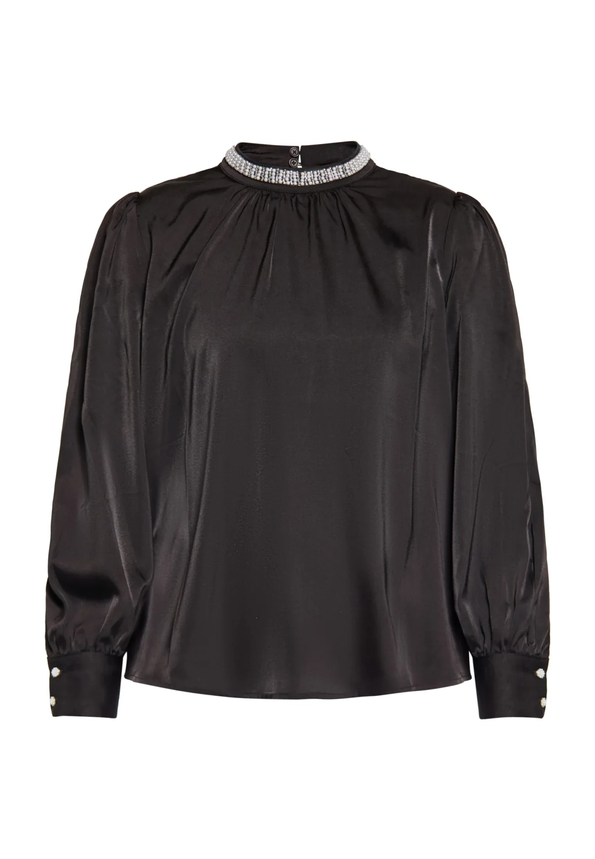 Geniet van de allure van deze voortreffelijke satijnen blouse. De hoge halslijn is versierd met een band met glinsterende versieringen, die een vleugje elegantie aan het stuk toevoegen. Dit overhemd heeft lange mouwen, verzameld in aansluitende manchetten en sluit met knopen, en straalt verfijning uit. Een enkele knoopsluiting aan de achterkant en een lichte glans maken de look compleet en bieden een ontspannen pasvorm die stijl en comfort moeiteloos combineert. Dit product maakt deel uit van de Elegant Shirt-collectie Blouse