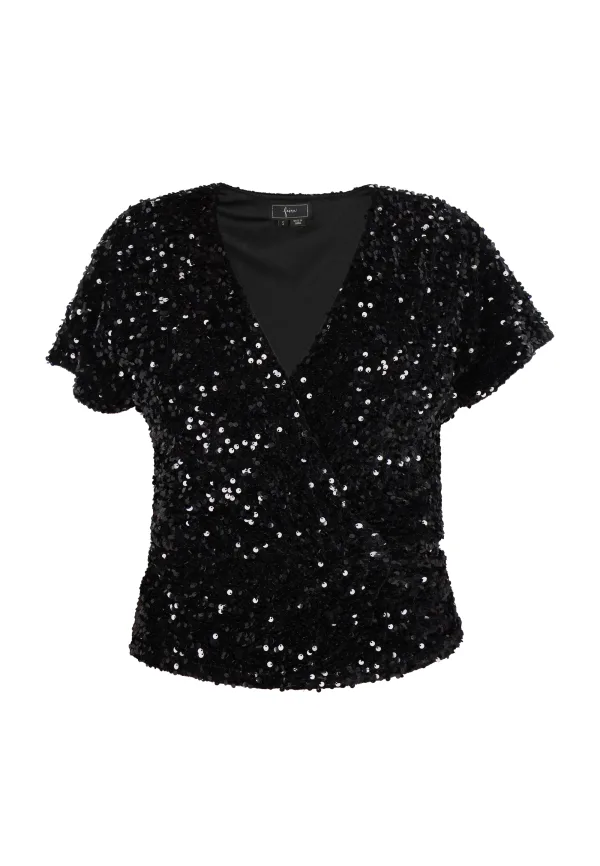 Voeg glamoureuze sprankeling toe aan je look met deze top met V-hals en een glinsterende, glitterende afwerking. De losvallende mouwen en het gedrapeerde silhouet zorgen voor een relaxte maar toch chique look. Perfect om een vleugje elegantie toe te voegen aan uw garderobe voor speciale gelegenheden. Blouse