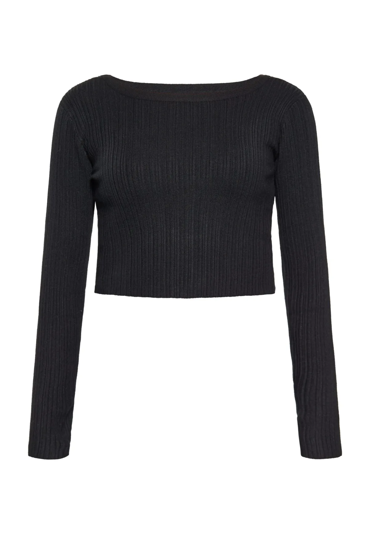 Maak kennis met een stijlvolle en moderne blouse met een open achterkant. Deze blouse met lange mouwen heeft een geribbelde textuur, een nauwsluitend silhouet en een brede ronde halslijn. De cropped lengte zorgt voor een trendy look, terwijl de unieke sluiting aan de achterkant met sierknopen voor een vleugje elegantie zorgt. Met aansluitende mouwen en rekbare stof is dit kledingstuk perfect voor iedereen die graag met zelfvertrouwen wil pronken met zijn stijl. Blouse