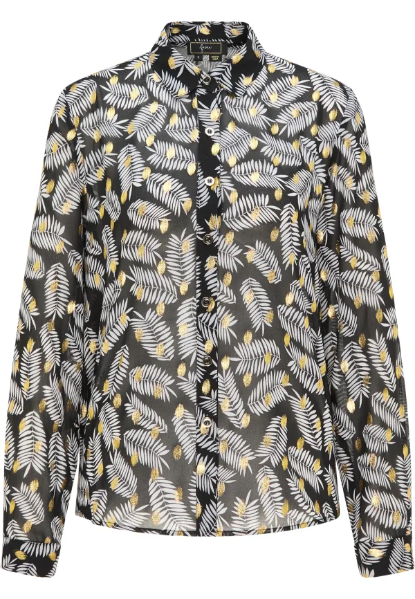 Geen vulling Deze vrouwelijke blouse van faina wordt gedomineerd door de lichte, semi-transparante stof en de opvallende print van bladeren met gouden details. De doorlopende knoopsluiting is versierd met goudkleurige knopen, die ook op de manchetten zitten. Een inspirerend ontwerp dat zowel overdag als 's avonds gedragen kan worden. Blouse