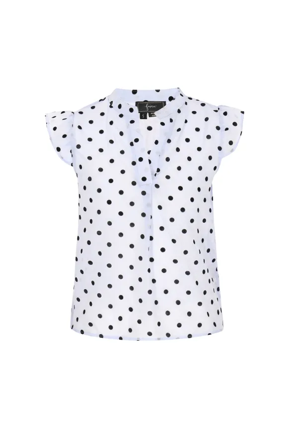 Blouse type: Blouseshirt; Design: Gevoerde zoom/rand; Materiaal: Viscose; Motief: Gestippeld; Kraag: Tuniek kraag; Details: Ruches, Plooien; Extra's: Licht transparant, All-over patroon; Pasvorm: Normale pasvorm; Armlengte: Kwartmouw; Lengte: Normale lengte