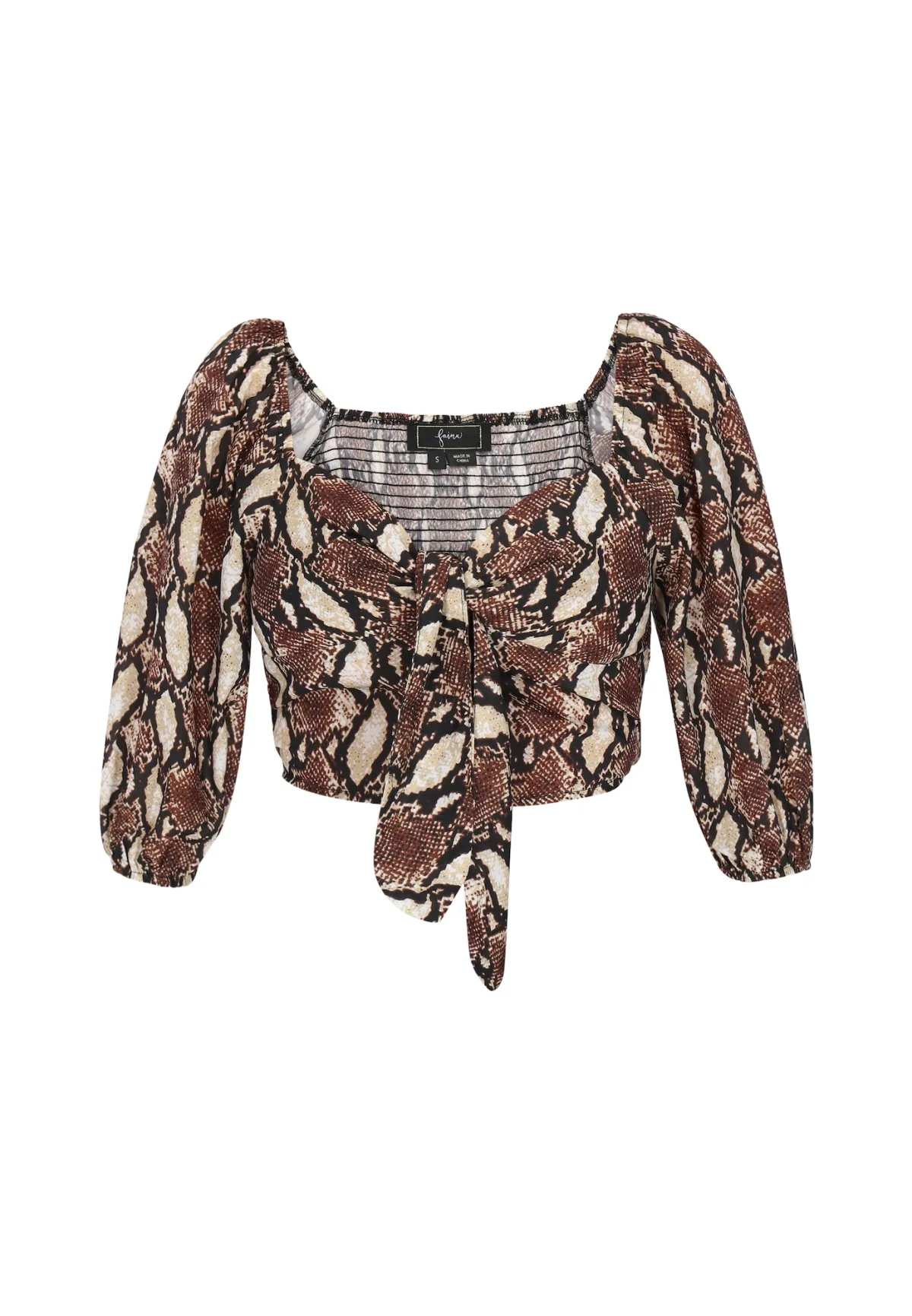 Blouse type: Wijde blouse; Design: Pofmouwen, Diepe snit/decolleté, Om te knopen/binden; Materiaal: Viscose; Motief: Dierenprint; Extra's: All-over patroon; Pasvorm: Losse pasvorm; Armlengte: Halve mouw; Lengte: Korte pasvorm