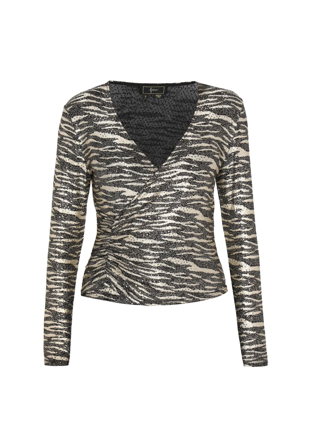 Blouse type: Wijde blouse; Design: Diepe snit/decolleté; Type sluiting: Slip; Motief: Dierenprint; Kraag: Zonder kraag; Details: Gedrapeerd; Extra's: All-over patroon; Pasvorm: Normale pasvorm; Armlengte: Lange mouw; Lengte: Normale lengte