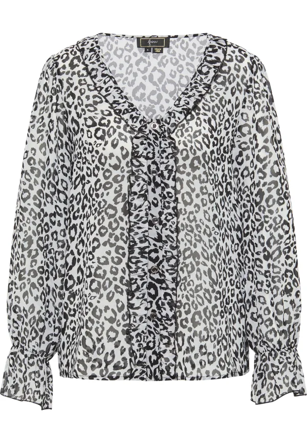 Faina presenteert deze blouse met een opvallende luipaardprint in een vloeiende, vrouwelijke look, waarbij de snit een prominente uitdrukking geeft. Het ontwerp oogt stijlvol en completeert zowel de alledaagse look als feestelijke avondoutfits. De blouse sluit in de licht getailleerde lijn met zilverkleurige knopen. Met dit silhouet is deze blouse een elegant modestuk dat bijzonder goed staat over strakke broeken en rokken.