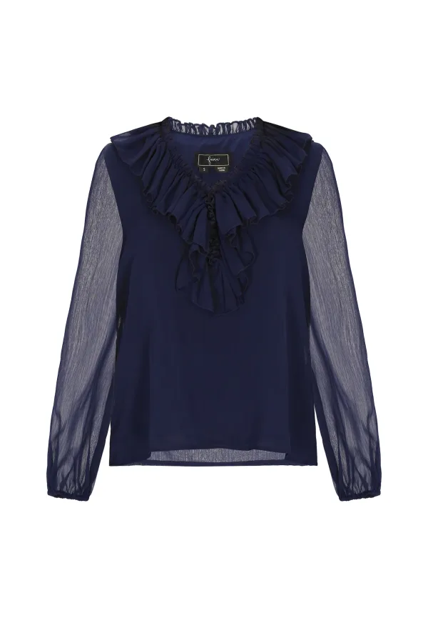 Blouse type: Blouseshirt; Design: Rechte zoom; Type sluiting: Slip; Materiaal: Chiffon; Motief: Effen; Details: Ruches; Extra's: Licht transparant; Pasvorm: Normale pasvorm; Armlengte: Lange mouw; Lengte: Normale lengte