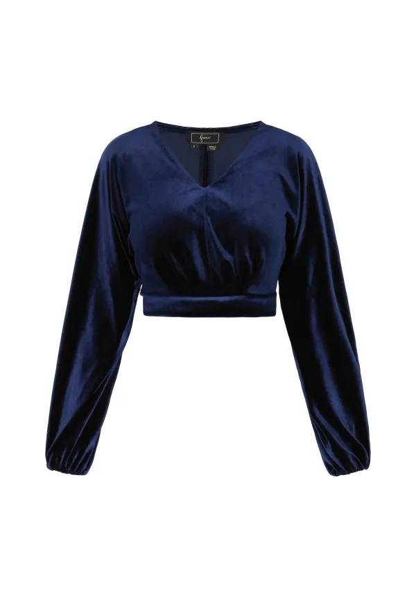 Blouse type: Blouseshirt; Design: Pofmouwen, Rug rits; Materiaal: Fluweel/Nicky Velours; Motief: Effen; Kraag: Zonder kraag; Details: Gedrapeerd; Extra's: Op staal naden; Pasvorm: Normale pasvorm; Armlengte: Lange mouw; Lengte: Korte pasvorm