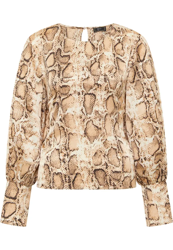 Zijdeachtige verleiding komt met deze blouse van faina. Het lichte en losjes vallende materiaal flatteert u, terwijl de exotische slangenprint u tot een onweerstaanbare blikvanger maakt. Speciale aandacht gaat uit naar de rughals, waar alleen een knoop en lint de blouse sluiten. Toon-op-toon decoratieve manchetknopen aan klassiek gehouden blousemouwen ademen stijlvolle elegantie. Deze blouse is een prachtige aanvulling op uw look en wordt aanbevolen bij zowel uw slanke broek met hoge taille als uw nauwsluitende rokken.