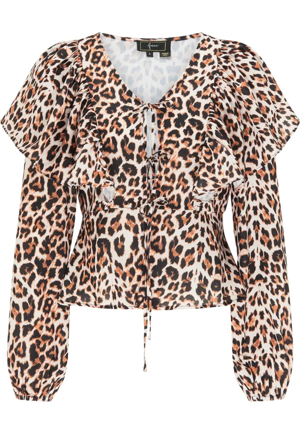 Geen vulling Deze blouse van faina heeft een speels ontwerp gecombineerd met een exotische luipaardprint. De grote ruches vallen charmant langs de zijkanten, terwijl de voorkant wordt gesloten met linten en strikken in plaats van knopen. Het slanke, getailleerde korte model met peplum toont ook van achteren geraffineerdheid. Een silhouet dat perfect tot zijn recht komt met een strakke broek. Blouse