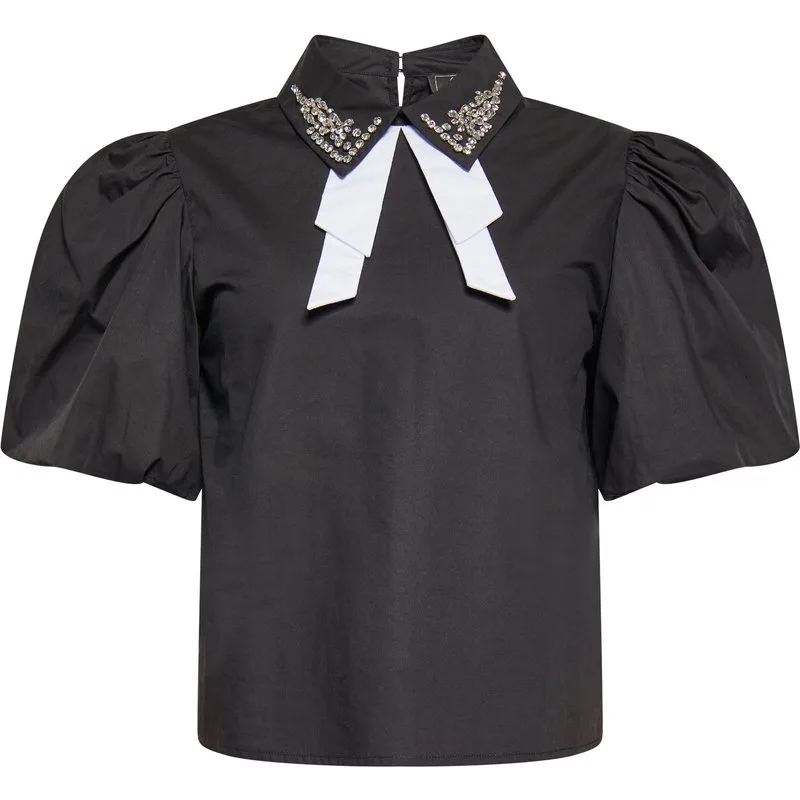 Deze elegante poplin blouse heeft een opvallende kraag met juwelen. Het contrasterende strikdetail loopt sierlijk van onder de kraag naar voren en voegt een vleugje verfijning toe. Met zijn korte pofmouwen combineert deze blouse naadloos formele en casual stijlen. De losse, vloeiende pasvorm creëert een chique en moeiteloze look die perfect is voor elke gelegenheid. Dit product maakt deel uit van de Elegant Shirt-collectie Blouse shirt