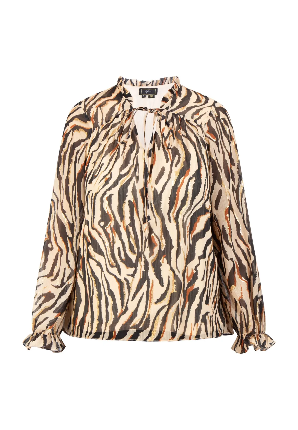 Goudkleurige accenten en een opvallende dierenprint, deze blouse van faina zult u geweldig vinden. De V-halslijn in combinatie met de ruchekraag en de vetersluiting siert vakkundig het decolleté, terwijl het leoprintmotief met de goudkleurige accenten een echte blikvanger is. De uiteinden van de mouwen hebben een elastische band en zijn dus ook licht gerimpeld.