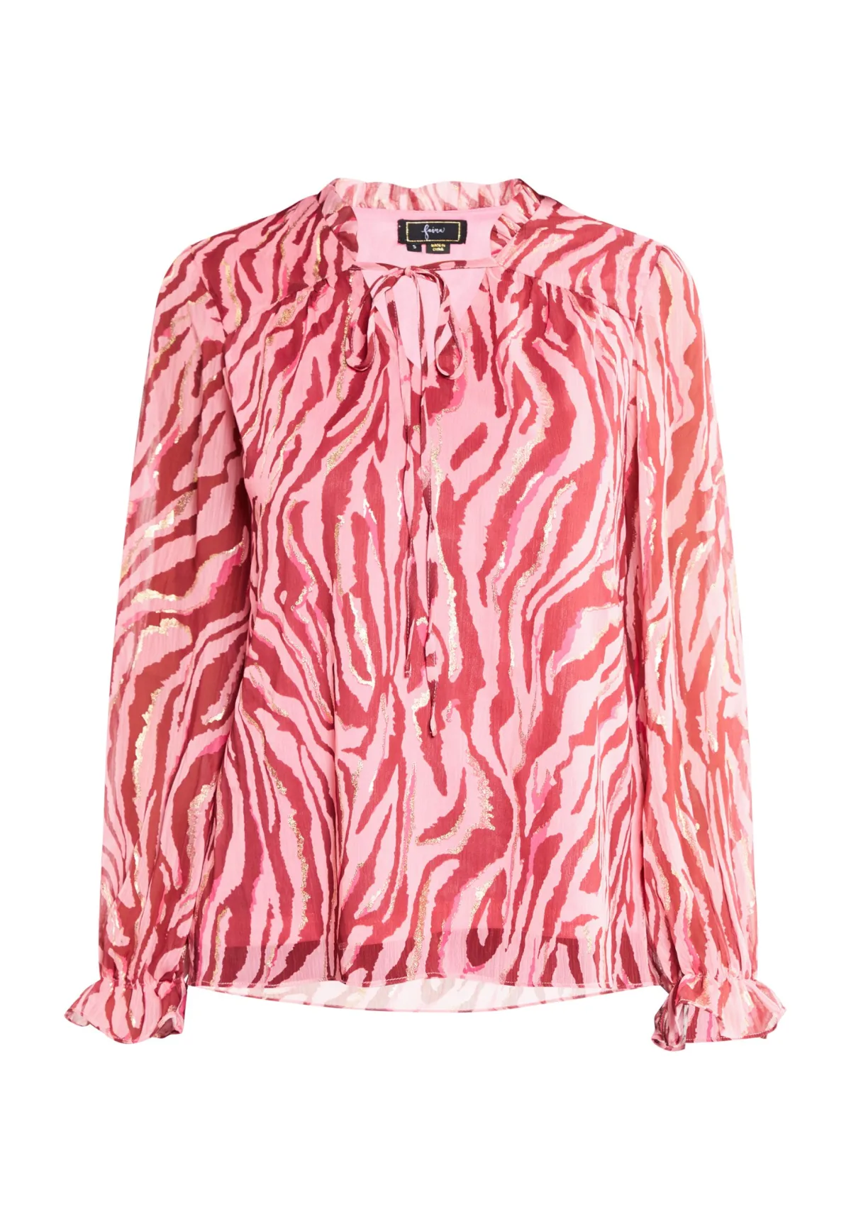 Goudkleurige accenten en een opvallende dierenprint, deze blouse van faina zult u geweldig vinden. De V-halslijn in combinatie met de ruchekraag en de vetersluiting siert vakkundig het decolleté, terwijl het leoprintmotief met de goudkleurige accenten een echte blikvanger is. De uiteinden van de mouwen hebben een elastische band en zijn dus ook licht gerimpeld.