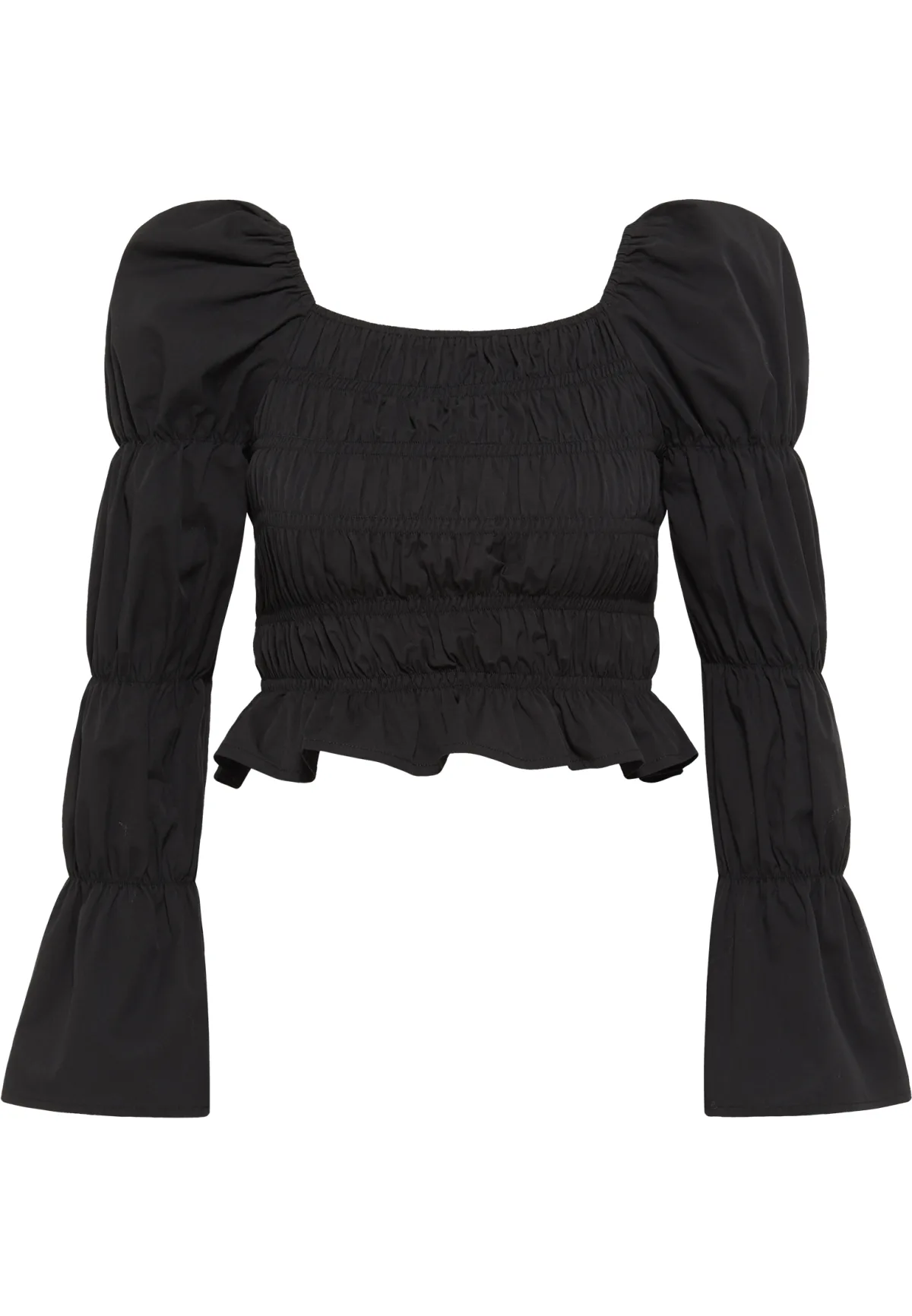 Verleidelijk of romantisch - geen blousestijl combineert beide zo vakkundig als de typische carmen blouse. faina brengt deze stijl juist met deze blouse in uw garderobe. Het gesmokte middenstuk zorgt voor een speelse look en tegelijkertijd voor een comfortabele pasvorm. Hetzelfde geldt voor de mouwen, waar elastische manchetten niet alleen zorgen voor een comfortabel draagcomfort, maar ook voor een perfecte pasvorm en een authentieke look in elke draagstijl. Romantisch met een vierkante halslijn of verleidelijk als carmen? Welk effect u ook kiest, in combinatie met een slanke broek of rok zorgen ze voor een onweerstaanbaar effect.