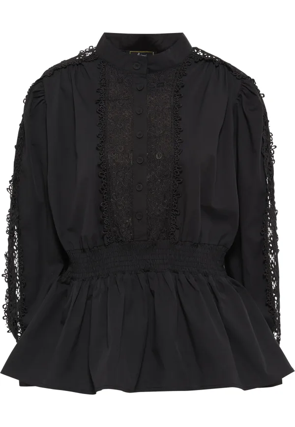 Deze blouse van faina is versierd met romantische details en ziet er onweerstaanbaar uit met een effen, slanke broek of rok en rode lippenstift. De ingewikkelde kantapplicaties, de kleine opstaande kraag en het gesmokte inzetstuk in de taille zorgen voor een geraffineerde tsarenlook die wordt versterkt door de geplooide schouders. Een knoopsluiting en lange manchetten met knopen completeren het verfijnde model.