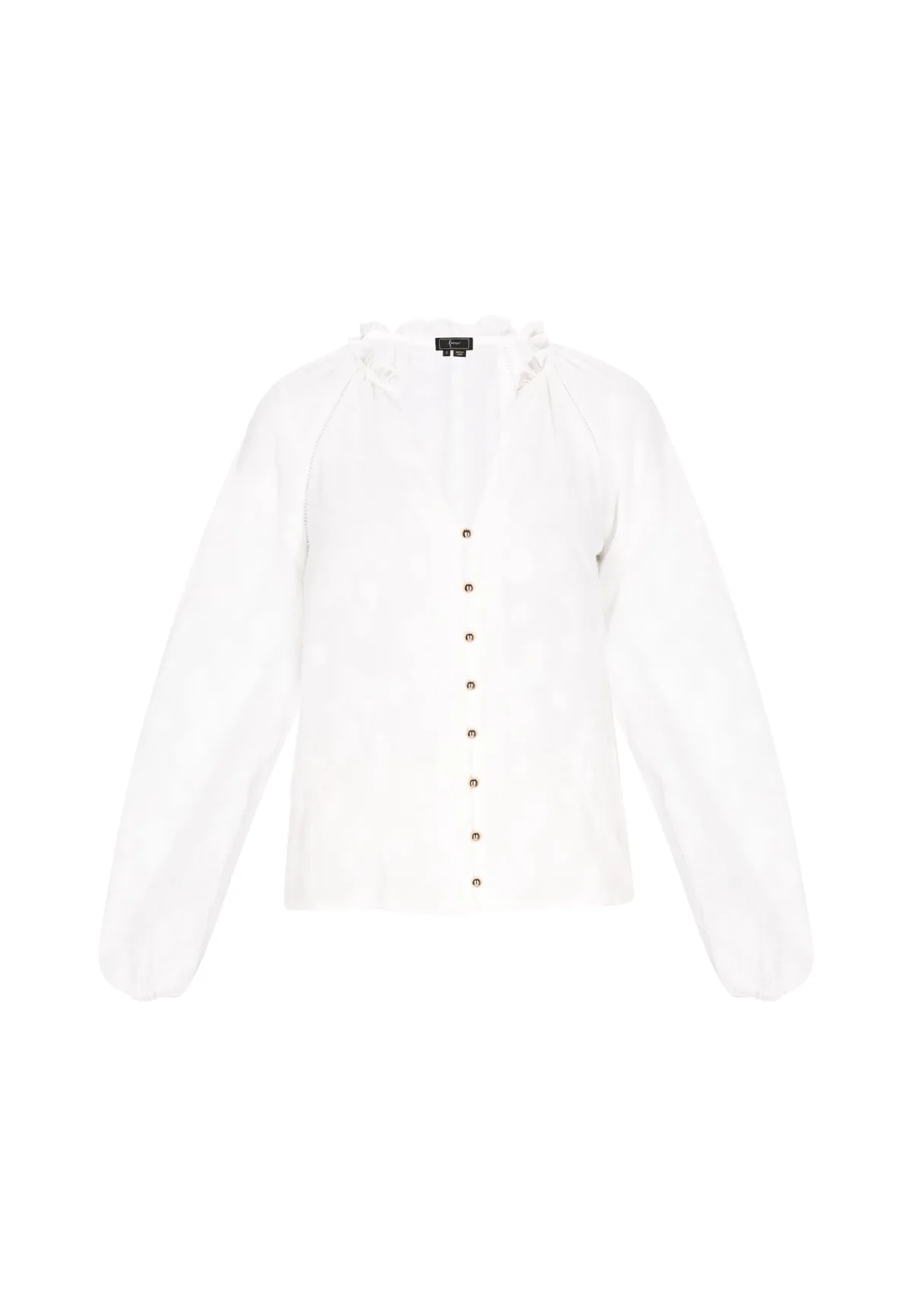 Blouse type: Klassieke blouse; Design: Gevoerde zoom/rand, Knop placket, Raglanmouwen; Type sluiting: Knoopsluiting; Materiaal: Chiffon; Motief: Effen; Kraag: Tuniek kraag; Details: Ruches, Borduursels, Gedrapeerd; Extra's: Op staal naden, Voelt zacht aan; Pasvorm: Losse pasvorm; Armlengte: Lange mouw; Lengte: Normale lengte