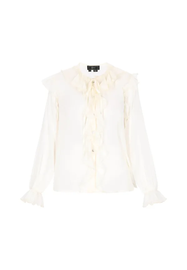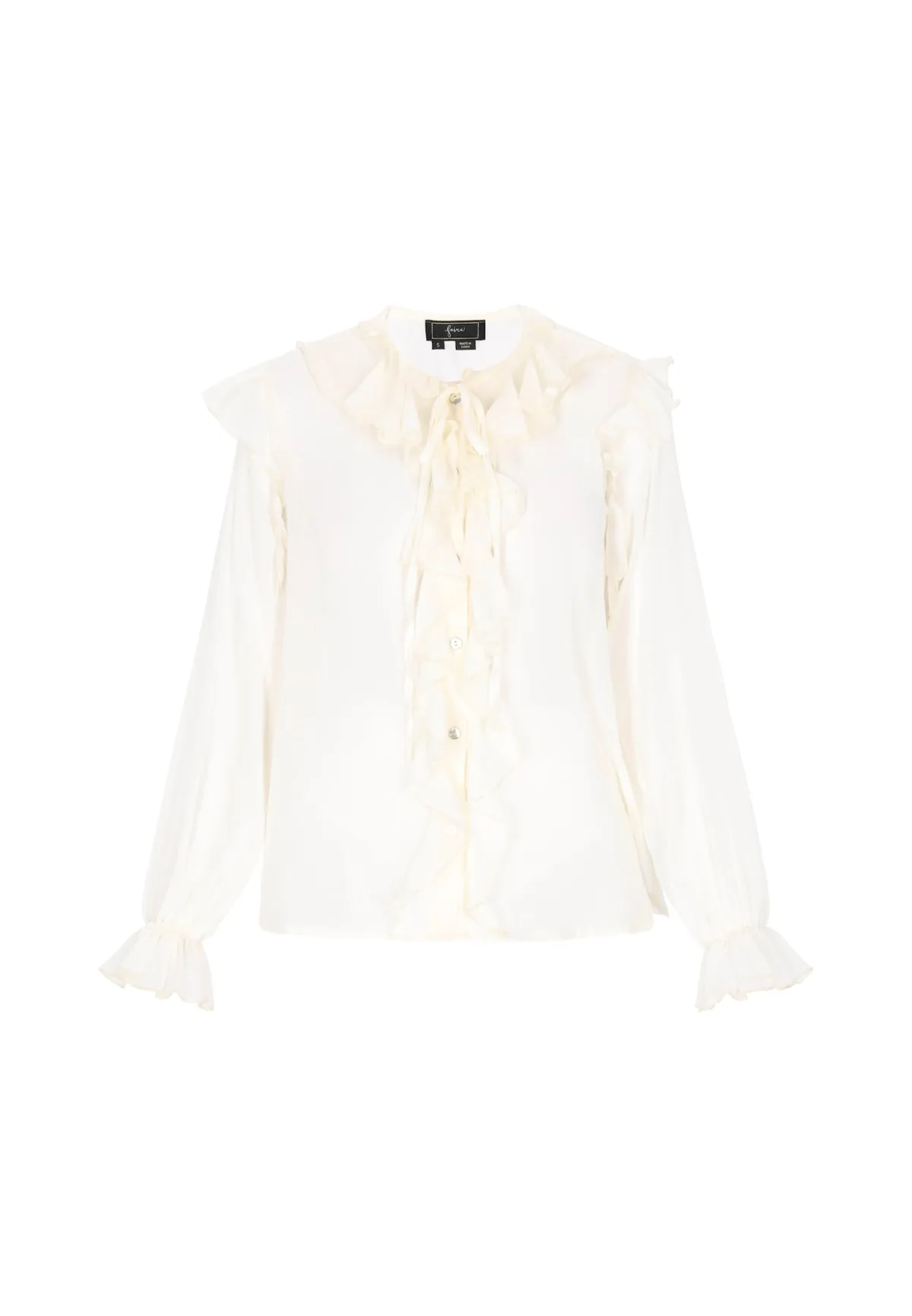 Blouse type: Klassieke blouse; Design: Knop placket, Pofmouwen; Type sluiting: Knoopsluiting; Materiaal: Chiffon; Motief: Effen; Kraag: Zonder kraag; Details: Ruches, Volant, Gedrapeerd; Extra's: Licht transparant, Lichte stof; Pasvorm: Losse pasvorm; Armlengte: Lange mouw; Lengte: Normale lengte