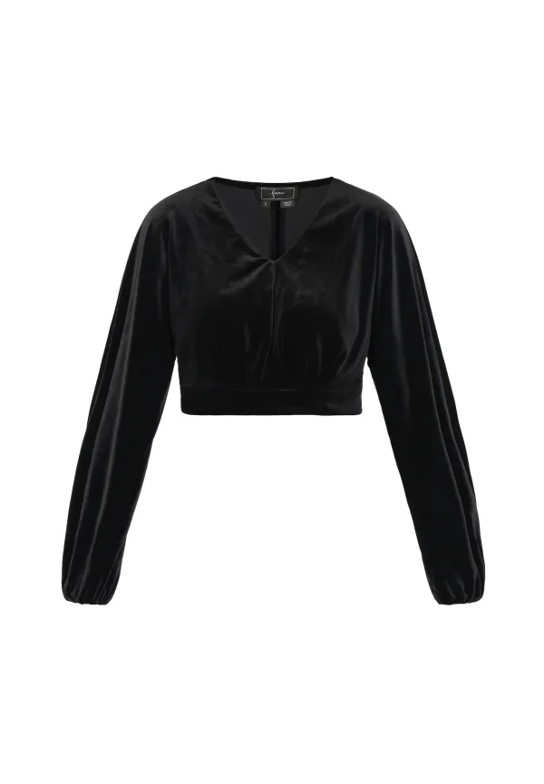 Blouse type: Blouseshirt; Design: Gevoerde zoom/rand, Elastische taille/zoom, Pofmouwen; Materiaal: Fluweel/Nicky Velours; Motief: Effen; Kraag: Zonder kraag; Details: Gedrapeerd; Extra's: Op staal naden, Voelt zacht aan; Pasvorm: Normale pasvorm; Armlengte: Lange mouw; Lengte: Korte pasvorm