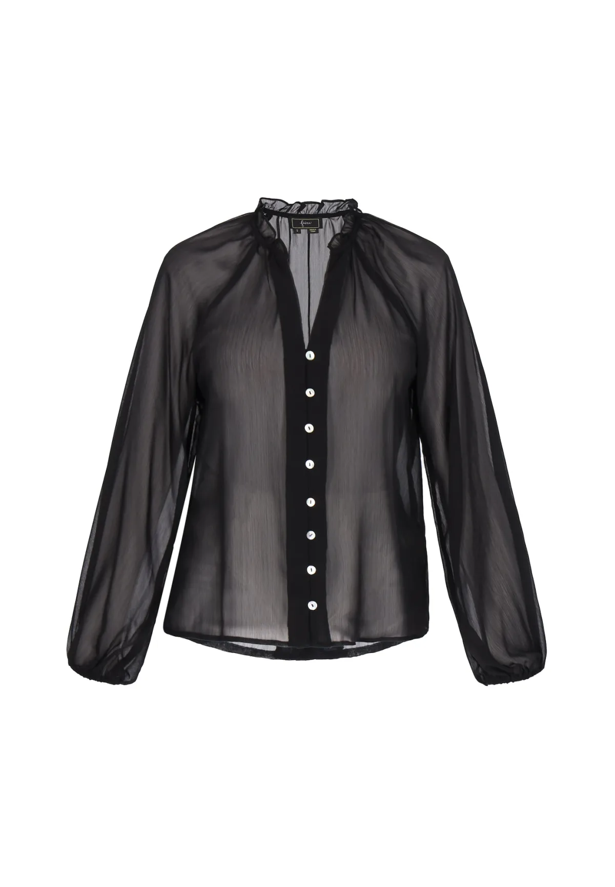 Blouse type: Klassieke blouse; Design: Gevoerde zoom/rand, Knop placket, Pofmouwen; Type sluiting: Knoopsluiting; Materiaal: Chiffon; Motief: Effen; Kraag: Tuniek kraag; Details: Ruches, Gedrapeerd; Extra's: Sterk transparant, Lichte stof; Pasvorm: Losse pasvorm; Armlengte: Lange mouw; Lengte: Normale lengte