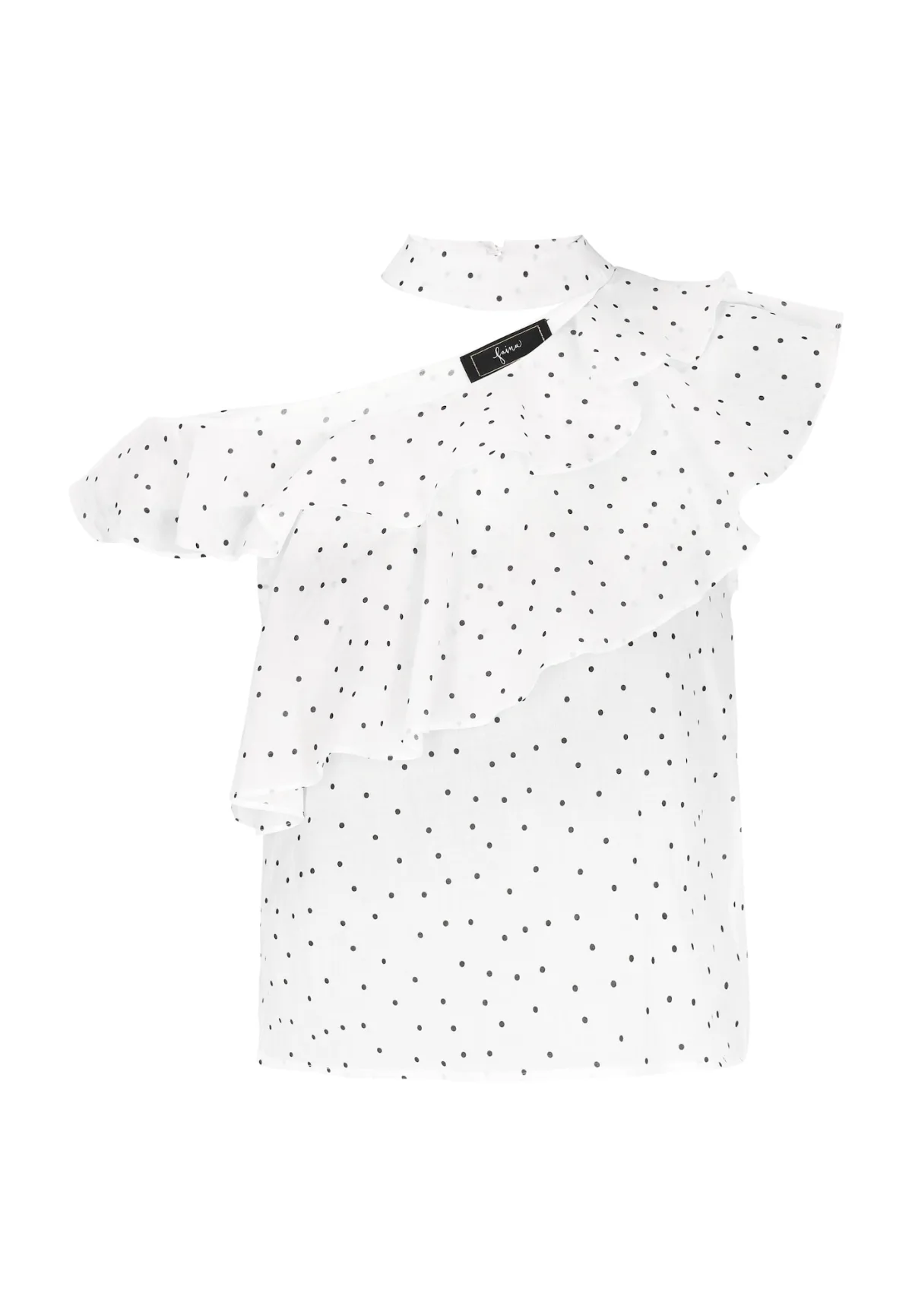 Blouse type: Blouseshirt; Type sluiting: Knoopsluiting; Materiaal: Viscose; Motief: Gestippeld; Kraag: Opstaande kraag; Details: Ruches; Pasvorm: Normale pasvorm; Armlengte: Mouwloos; Lengte: Normale lengte