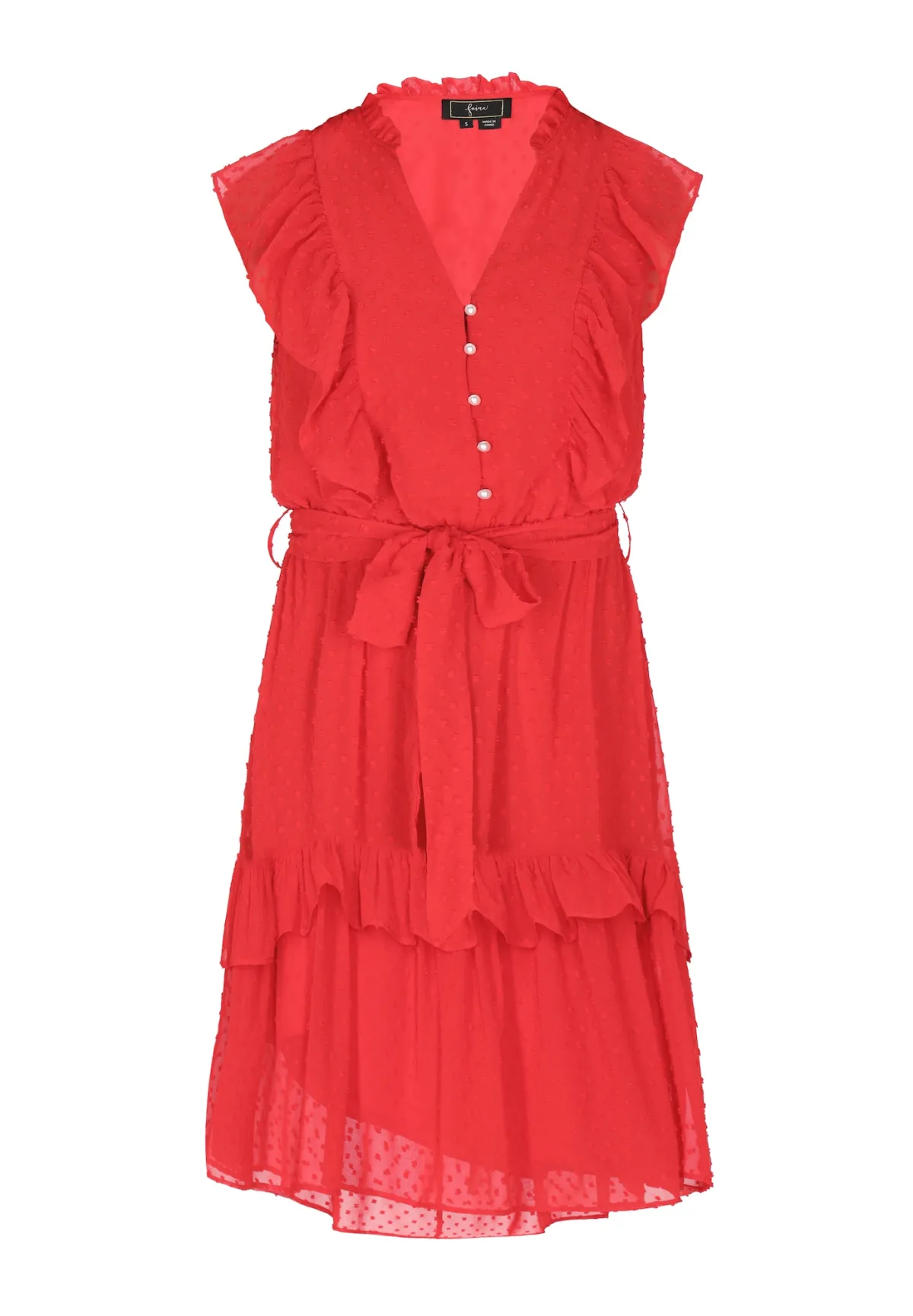 Dompel jezelf onder in de allure van dit boeiende kledingstuk, versierd met een structuurstof en voorzien van delicate verhoogde stippen. De V-hals en de knoopsluiting aan de voorkant stralen elegantie uit, terwijl de ruches in de vorm van een kap over de schouders voor een speels tintje zorgen. Een stoffen riem benadrukt op elegante wijze de taille met een strikdetail. Jurk