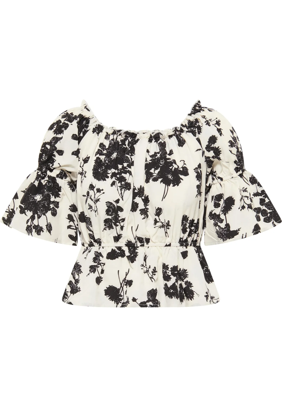 Voeg een extravagante touch toe aan je garderobe met deze bloemenprint carmen blouse van faina. Hij is gemaakt van zacht materiaal, voelt zeer zacht aan, is luchtig en licht. Dankzij de brede halslijn met elastische tailleband kan hij off-shoulder gedragen worden, als trendy carmen blouse. De halflange mouwen zijn ook voorzien van elastiek om een fladderende volant te creëren. Een elastische band in de taille zorgt voor een charmant silhouet.