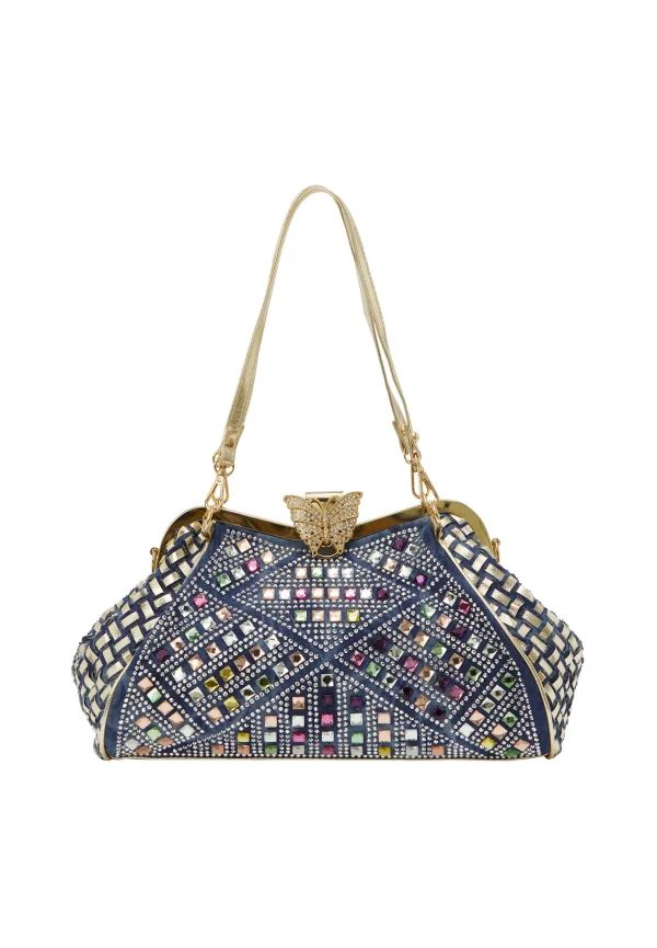 faina Clutch blauw denim / goud / lichtgroen / pink