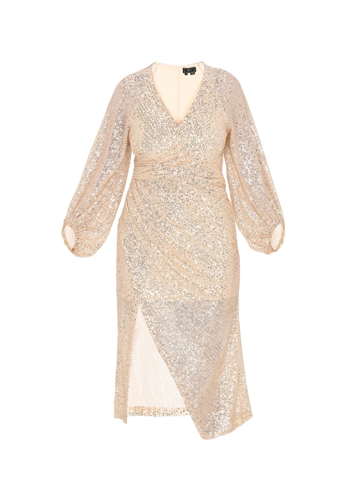 Design: Pofmouwen, Rug rits; Type sluiting: Ritssluiting; Halstype: Wikkeltop; Motief: Effen; Details: Pailletten, Gedrapeerd; Extra's: Glitterend, Met textuur; Lengte: 3/4 lengte; Snit: Getailleerd; Pasvorm: Slanke pasvorm; Armlengte: Lange mouw
