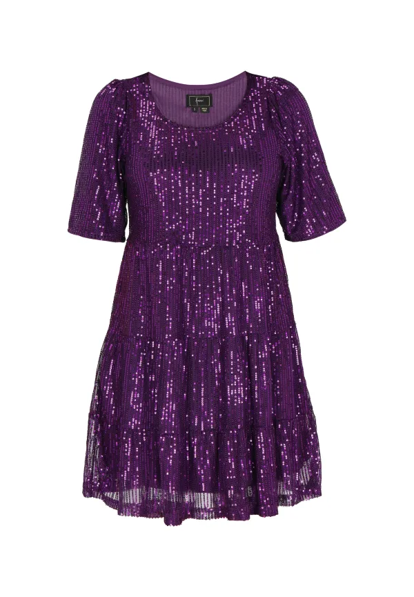 Design: Gevoerde zoom/rand, Met onderjurk; Type sluiting: Slip; Halstype: Ronde hals; Motief: Effen; Details: Pailletten, Ruches; Extra's: Glinsterend, Met textuur; Lengte: Kort/mini; Snit: Uitlopend; Pasvorm: Normale pasvorm; Armlengte: Kwartmouw