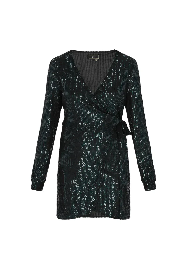 Design: Pofmouwen; Type sluiting: Riemsluiting; Halstype: V-hals; Motief: Effen; Details: Pailletten, Wikkel design; Extra's: Glinsterend, Met textuur; Lengte: Kort/mini; Snit: Figuur omarmend; Pasvorm: Slanke pasvorm; Armlengte: Lange mouw