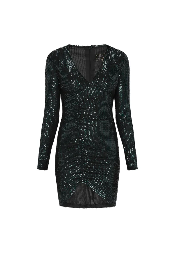 Design: Asymmetrische zoom; Type sluiting: Ritssluiting; Halstype: V-hals; Motief: Effen; Details: Pailletten, Gedrapeerd; Extra's: Glinsterend, Met textuur; Lengte: Kort/mini; Snit: Figuur omarmend; Pasvorm: Slanke pasvorm; Armlengte: Lange mouw