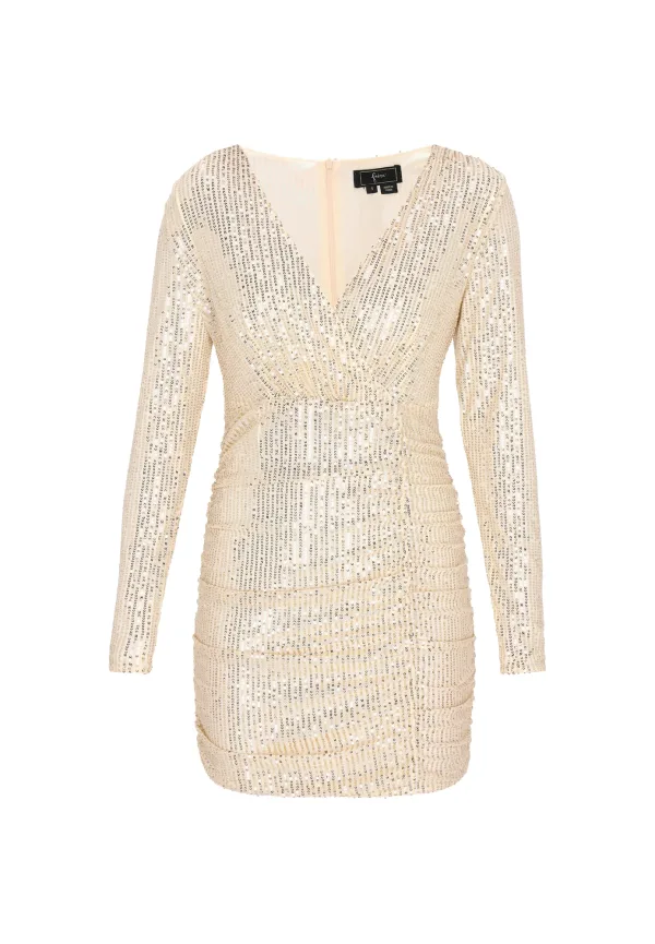 Type sluiting: Ritssluiting; Halstype: V-hals; Motief: Effen; Details: Pailletten, Gedrapeerd, Wikkel design; Extra's: Glitterend, Op staal naden; Lengte: Kort/mini; Snit: Figuur omarmend; Pasvorm: Slanke pasvorm; Armlengte: Lange mouw