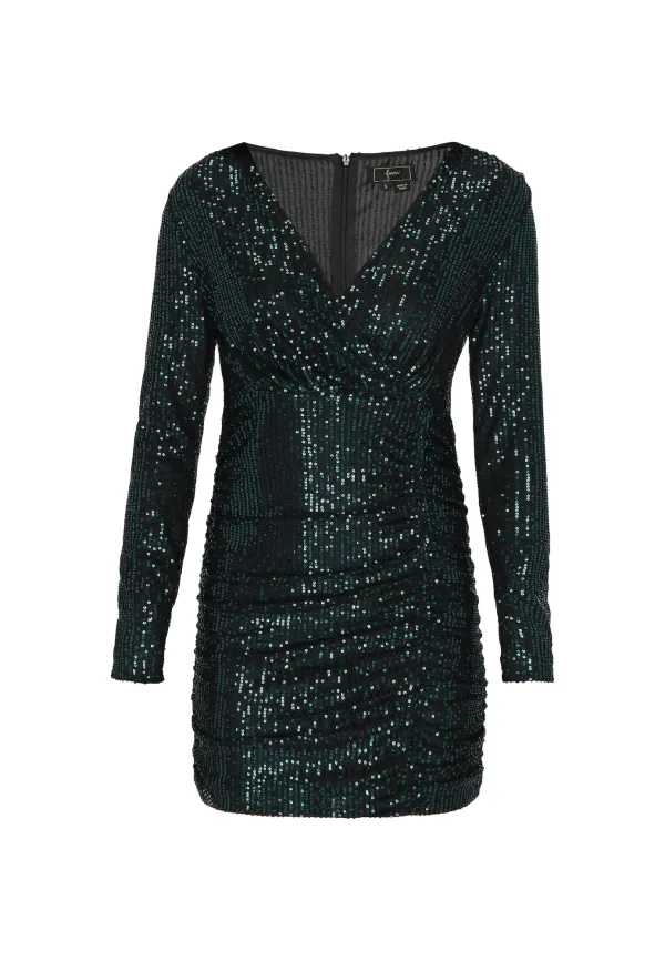 Design: Rug rits; Type sluiting: Ritssluiting; Halstype: V-hals; Motief: Effen; Details: Pailletten, Gedrapeerd, Wikkel design; Extra's: Op staal naden; Lengte: Kort/mini; Snit: Figuur omarmend; Pasvorm: Slanke pasvorm; Armlengte: Lange mouw