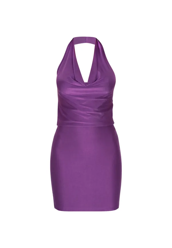 Design: Gevoerde zoom/rand; Type sluiting: Slip; Materiaal: Satijn; Halstype: Watervalhals; Motief: Effen; Soort bandjes: Haltermodel; Details: Gedrapeerd, Backless; Extra's: Op staal naden; Lengte: Kort/mini; Snit: Figuur omarmend; Pasvorm: Slanke pasvorm; Armlengte: Mouwloos