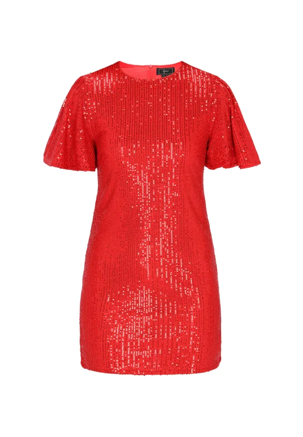 Design: Rechte zoom; Type sluiting: Ritssluiting; Halstype: Ronde hals; Motief: Effen; Details: Pailletten, Gedrapeerd; Extra's: Glinsterend, Met textuur; Lengte: Kort/mini; Snit: Recht; Pasvorm: Normale pasvorm; Armlengte: Kwartmouw