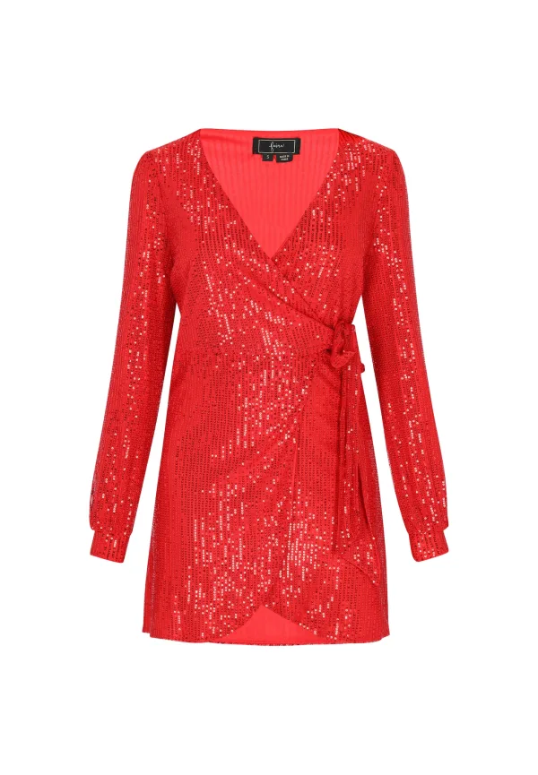 Design: Gevoerde zoom/rand, Pofmouwen; Type sluiting: Riemsluiting; Halstype: V-hals; Motief: Effen; Details: Pailletten, Wikkel design; Extra's: Glinsterend, Met textuur; Lengte: Kort/mini; Snit: Figuur omarmend; Pasvorm: Slanke pasvorm; Armlengte: Lange mouw