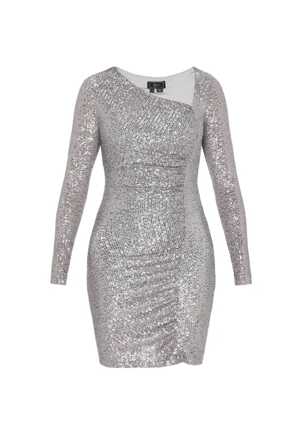 Design: Gevoerde zoom/rand, Rechte zoom; Type sluiting: Slip; Details: Pailletten, Gedrapeerd; Extra's: Glitterend, Applicaties; Lengte: Kort/mini; Snit: Figuur omarmend; Pasvorm: Aansluitende pasvorm; Armlengte: Lange mouw