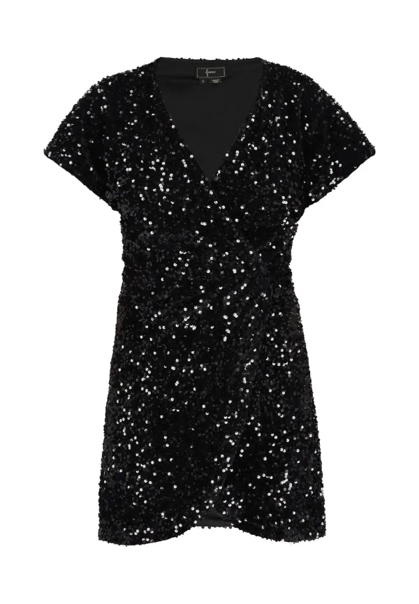 Deze chique en elegante jurk met V-hals en wikkeldesign creëert een elegante gelaagde look. De aansluitende taille zorgt voor een mooi silhouet, terwijl de licht uitlopende rok voor een relaxte touch zorgt. De glitter- of paillettentextuur vangt het licht op voor een prachtig effect. Perfect voor elke gelegenheid: deze knielange jurk zal zeker de aandacht trekken met zijn opvallende stijl. Jurk