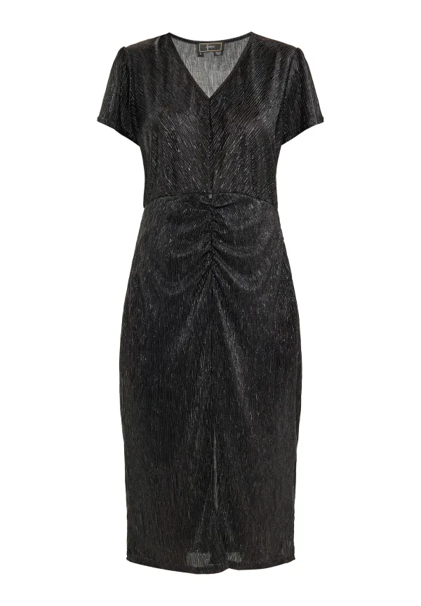 Een glinsterende midi-jurk met plooien is een prachtig feeststuk dat elegantie en verfijning uitstraalt. Deze lange jurk met korte mouwen is perfect voor elke avondgelegenheid dankzij de V-hals en kreukels die een gedrapeerd effect creëren. De glanzende, gestructureerde stof geeft de rechte, knielange rok een sprankeling. Een veelzijdige jurk voor uitgaan die naadloos overgaat van semi-formele naar formele evenementen. Dit product maakt deel uit van de Party Mix-collectie Jurk