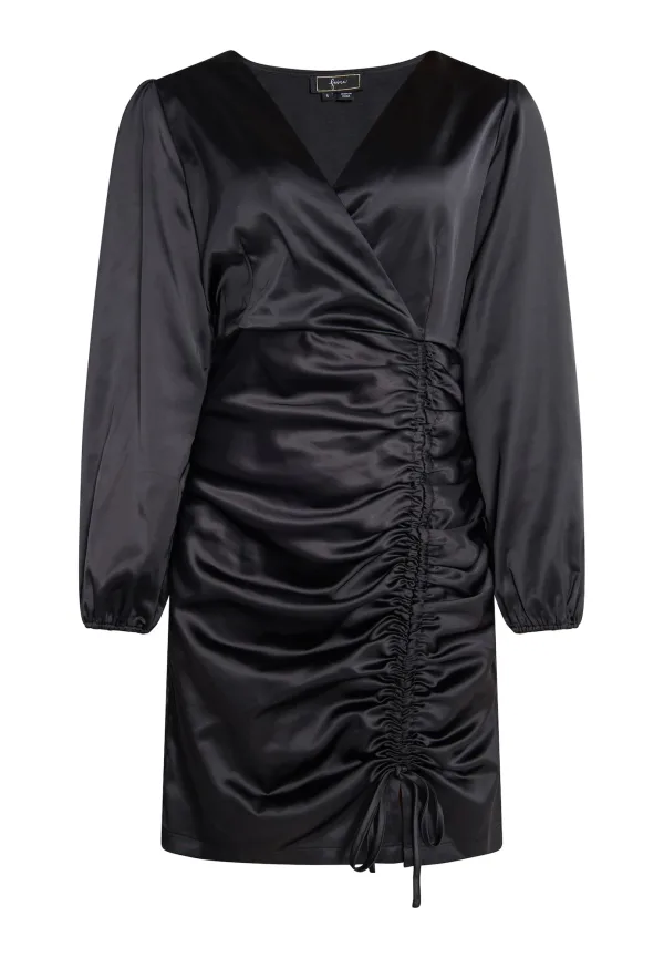 Dit sensuele mini-jurkje van faina is perfect om uit te gaan. Het nauwsluitende ontwerp overtuigt door de glanzende satijnen stof en de ruches aan het rokgedeelte, waarmee de roklengte individueel kan worden gevarieerd. Een diepe, vrouwelijke V-hals in wikkellook, pofmouwen en elastische manchetten maken het model compleet. Mini-jurk met lange mouwen