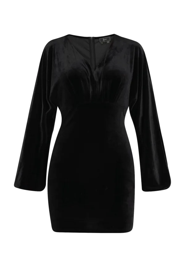 Geef je stijl een boost met deze elegante fluwelen mini-jurk met V-hals en klokvormige lange mouwen. Perfect voor een avondje uit, de aansluitende taille en getailleerde naden accentueren je figuur terwijl de recht gesneden rok sierlijk boven de knie valt. De luxueuze glans van de stof voegt een vleugje verfijning toe aan dit vrouwelijke silhouet. Ritssluiting aan de achterkant zorgt voor gemakkelijk dragen voor elke gelegenheid. Dit product maakt deel uit van de Velvet-collectie Jurk