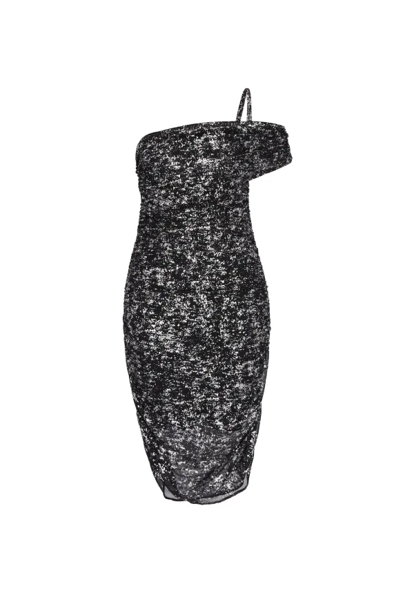 Design: Gevoerde zoom/rand, Rechte zoom; Type sluiting: Slip; Motief: Effen; Soort bandjes: One-shoulder; Details: Gedrapeerd; Extra's: Glinsterend; Lengte: Knielengte; Snit: Figuur omarmend; Pasvorm: Aansluitende pasvorm; Armlengte: Kwartmouw