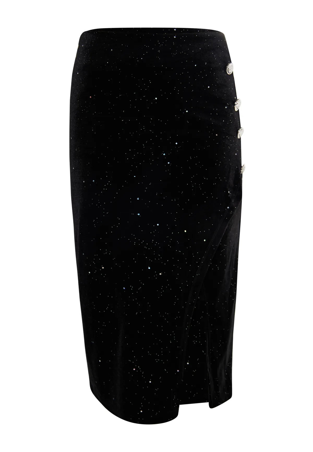 Met de nauwsluitende kokerrok van faina trek je op je volgende evenement alle aandacht. Het asymmetrische model is gemaakt van zacht stretchfluweel en is versierd met zilverkleurige holo-glitter en kleine steentjes. Het kuitlange model heeft een spannend wikkeleffect en een hoge split die de benen elegant accentueert. We maken de look compleet met hoge hakken en de bijpassende top van het label. midirok